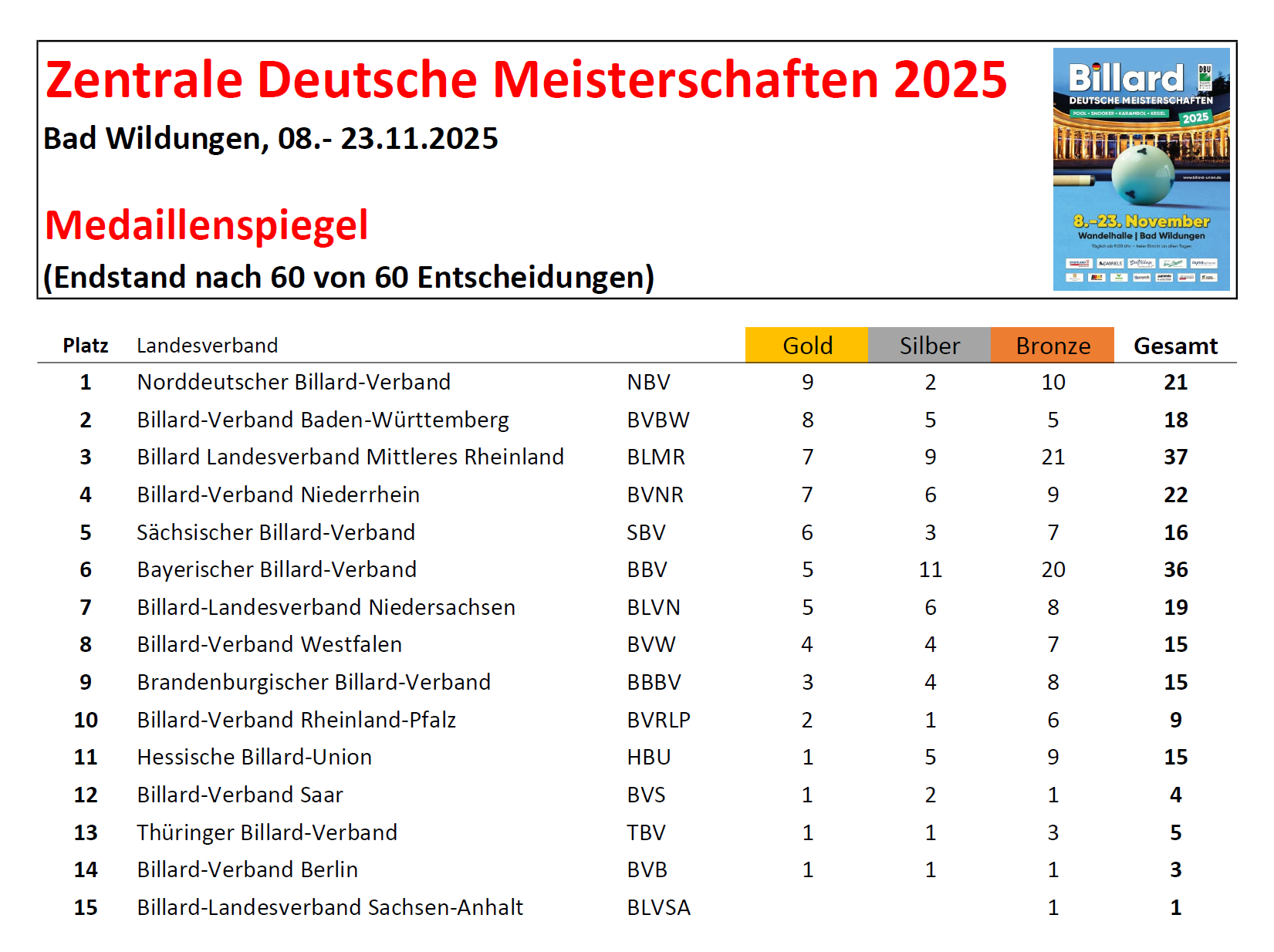 Willkommen auf der Mediaseite zu den Zentralen Deutschen Meisterschaften 2025 der Jugend und Erwachsenen, die vom 8. bis 23. November in Bad Wildungen ausgetragen werden. Hier finden sich alle wichtigen Informationen zur sechzehntägigen Veranstaltung der Deutschen Billard-Union (DBU), ergänzt durch tägliche Updates mit aktuellen Berichten und Bildern.