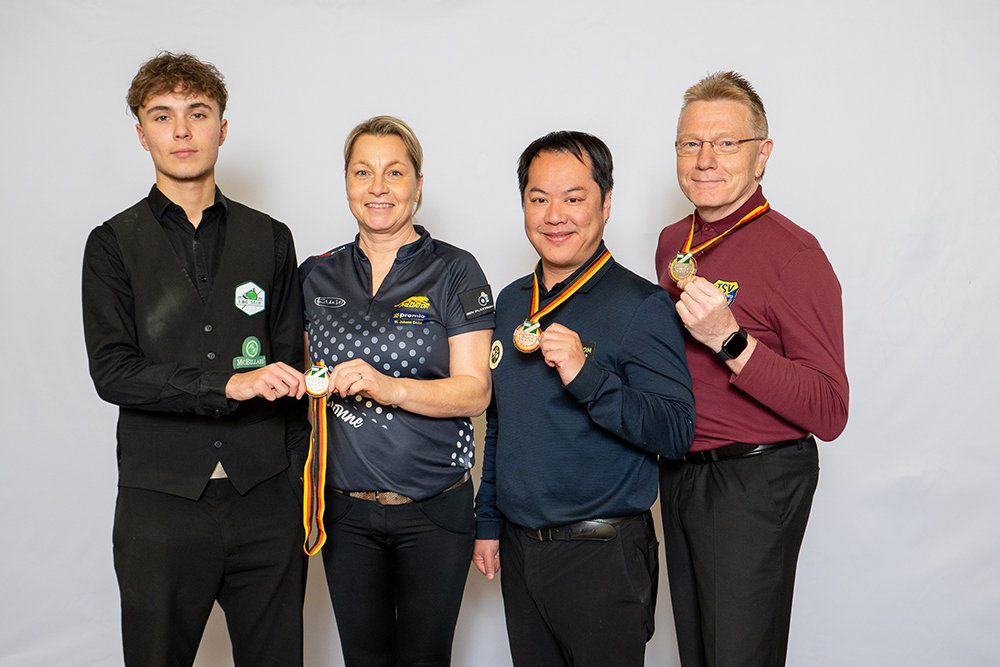 Bereits gestern stand im Dreiband der Herren auf dem Matchbillard der Regensburger Tay-Dien Truong als Bronzemedaillengewinner fest. Nachdem heute auch das Finale zwischen seinem Bezwinger Martin Horn (BC International Berlin) und Carsten Raspel vom Bergisch Gladbacher BC gespielt wurde – mit dem Sieger Martin Horn – erhielt Tay bei der Abschlusssiegerehrung heute seine verdiente zweite Einzelmedaille.