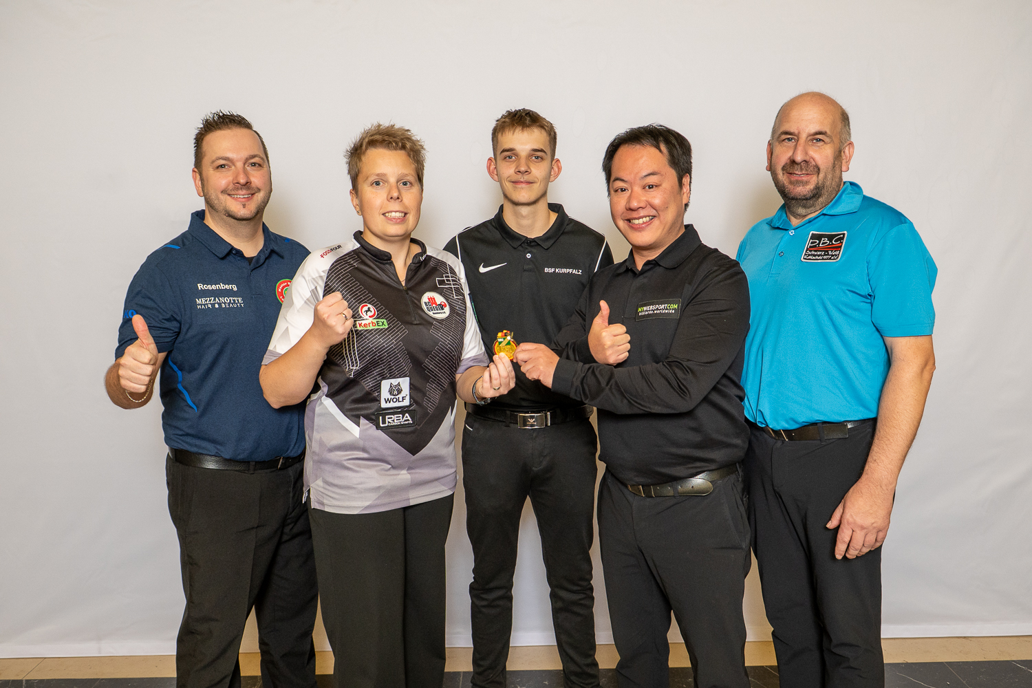 Am Sonntag standen bei den Deutschen Billardmeisterschaften insgesamt fünf Entscheidungen auf dem Programm. Drei Goldmedaillen wurden im Pool-Billard vergeben, je eine im Dreiband und im 5-Kegel. Über die Siege jubelten (im Foto von links): Toni Rosenberg, Vivien-Kathy Schade, Eric Mattern, TayDien Truong und Dirk Stenten.